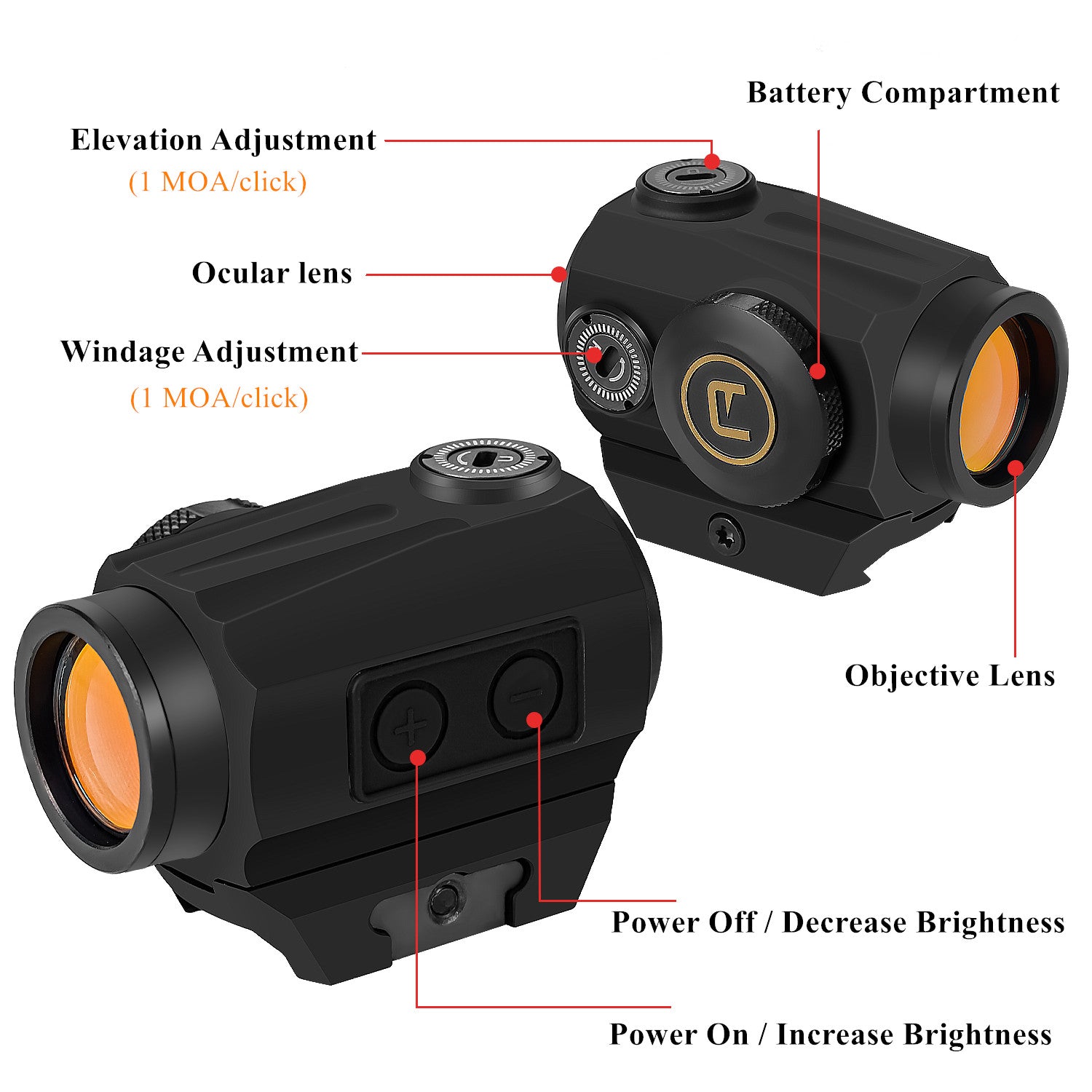 - ๐๐ฎ๐๐ ๐ญ๐ฒ๐ฟ๐ผ & ๐๐ผ๐น๐ฑ ๐ญ๐ฒ๐ฟ๐ผ ๐ช๐ฒ๐น๐น - 1 MOA per click W&E adjustment with crisp sound, it helps you judge the offset to adjust, easy to return to zero. Side-loading battery compartment allows for quick battery replacement without removing the rifle sight from your equipment.